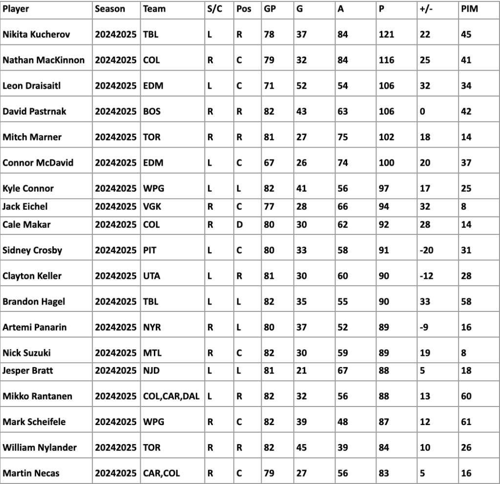 This list shows the top 20 NHL players from the 2024–25 season, based on their performance across key stats like goals, assists, and total points. Whether they led the league in scoring or made a major impact on both ends of the ice, these players stood out over the course of the season.